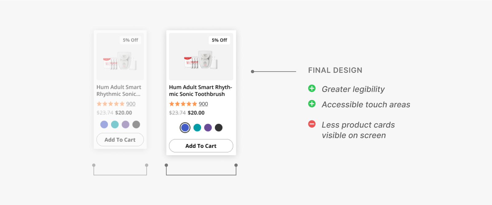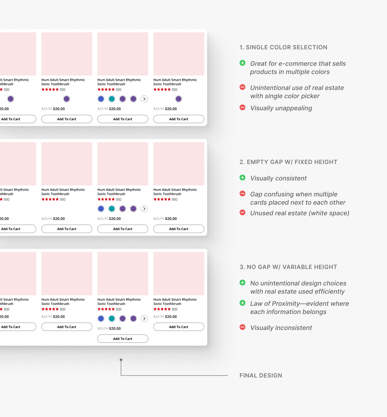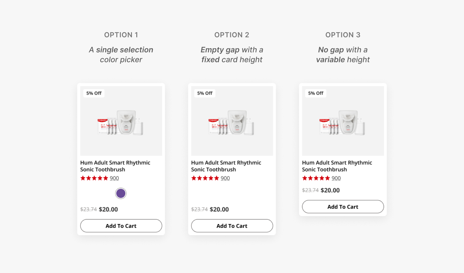 Previous ShopSmiles' product cards did not show color options, as most of its products are offered in a single color. However, the business team requested a color picker for the products offered in multiple colors, meaning those offered in only one color would instead have to show: