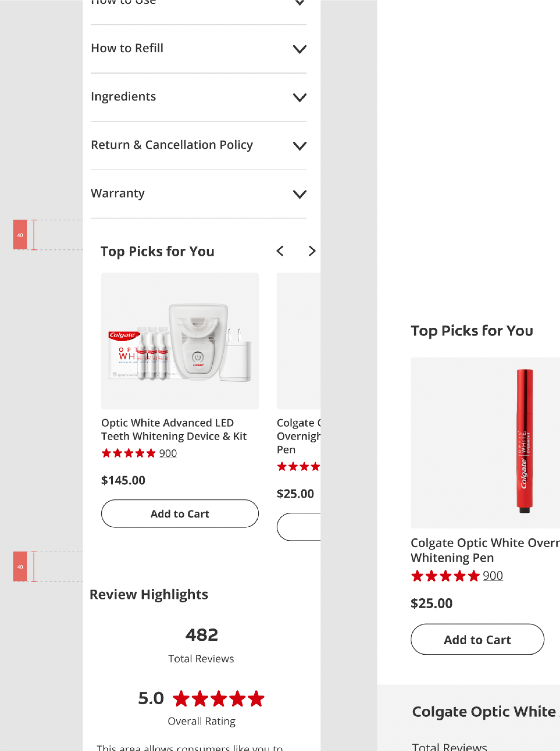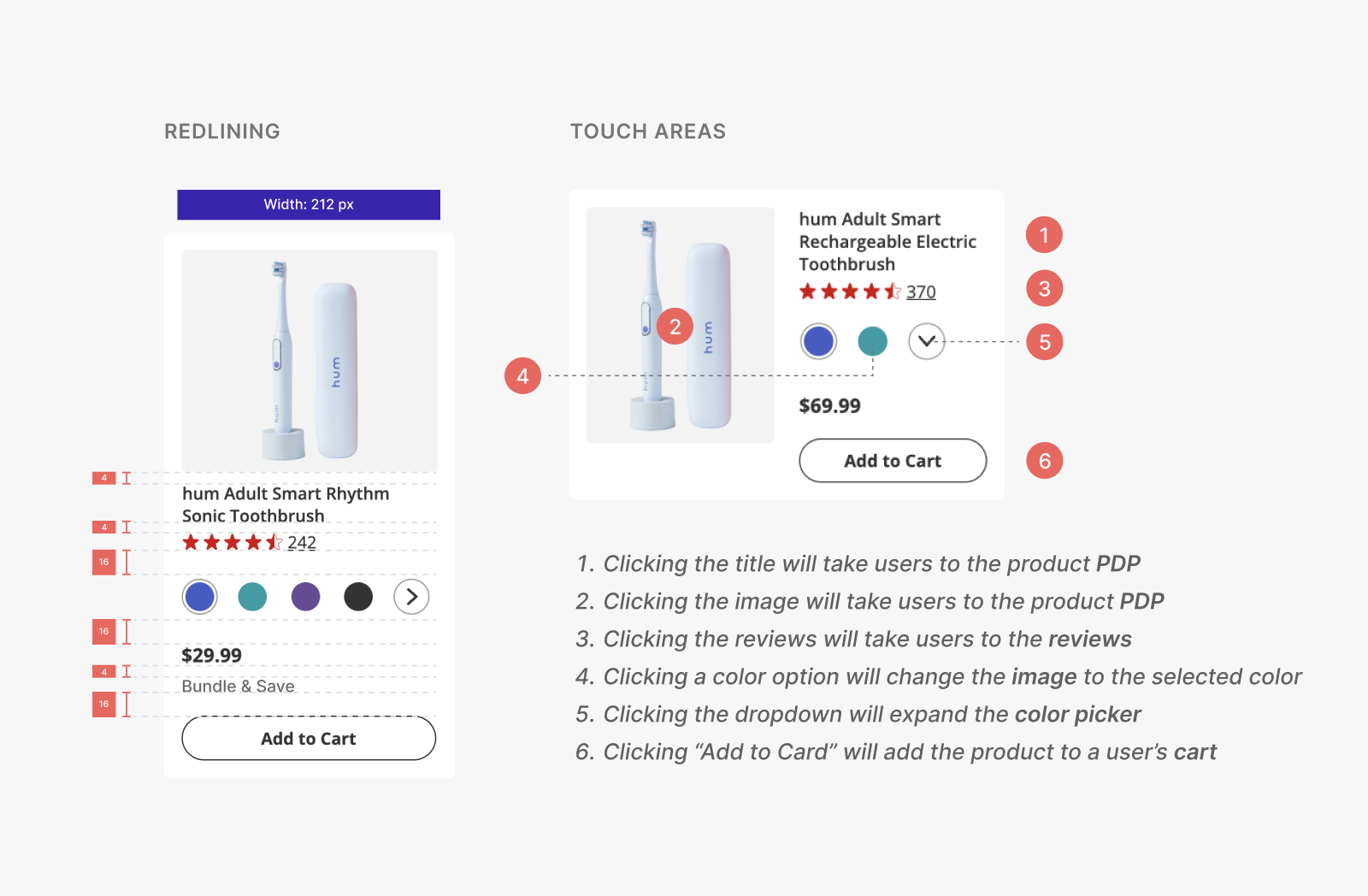 My mentor and I also documented and redlined the new cards, explicitly indicating its usage, spacing, touch areas, and more, for ShopSmiles' developers and any other involved.