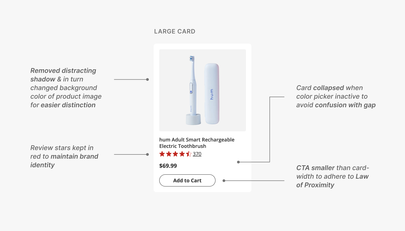 As previously mentioned, we were able to successfully reduce the component variation of product cards (base state without the color picker) from 6 to 3.