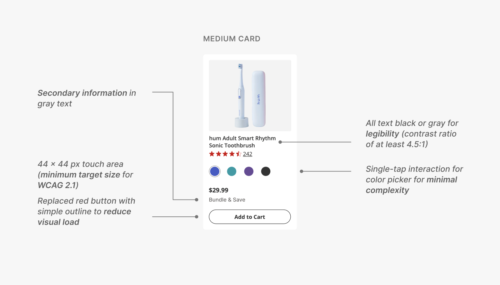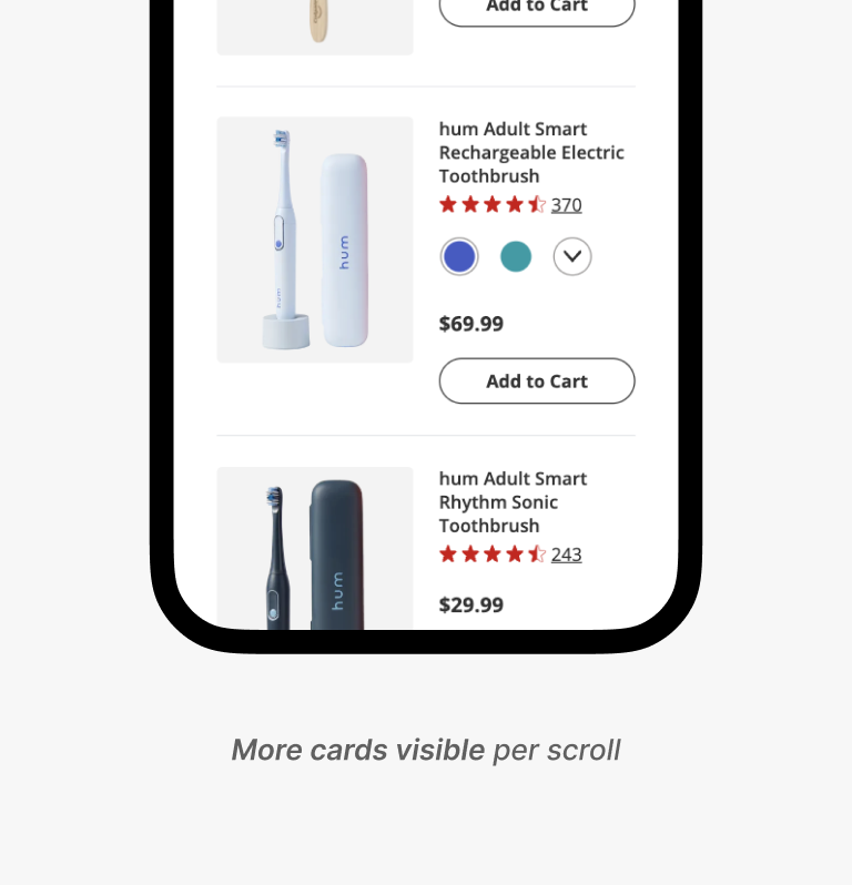 Although a single component, product cards touch upon most areas of the retail experience and act as the main drivers of purchase decisions by providing a product's highest-level summary. They allow shoppers to easily compare different products, which is a big user "want."