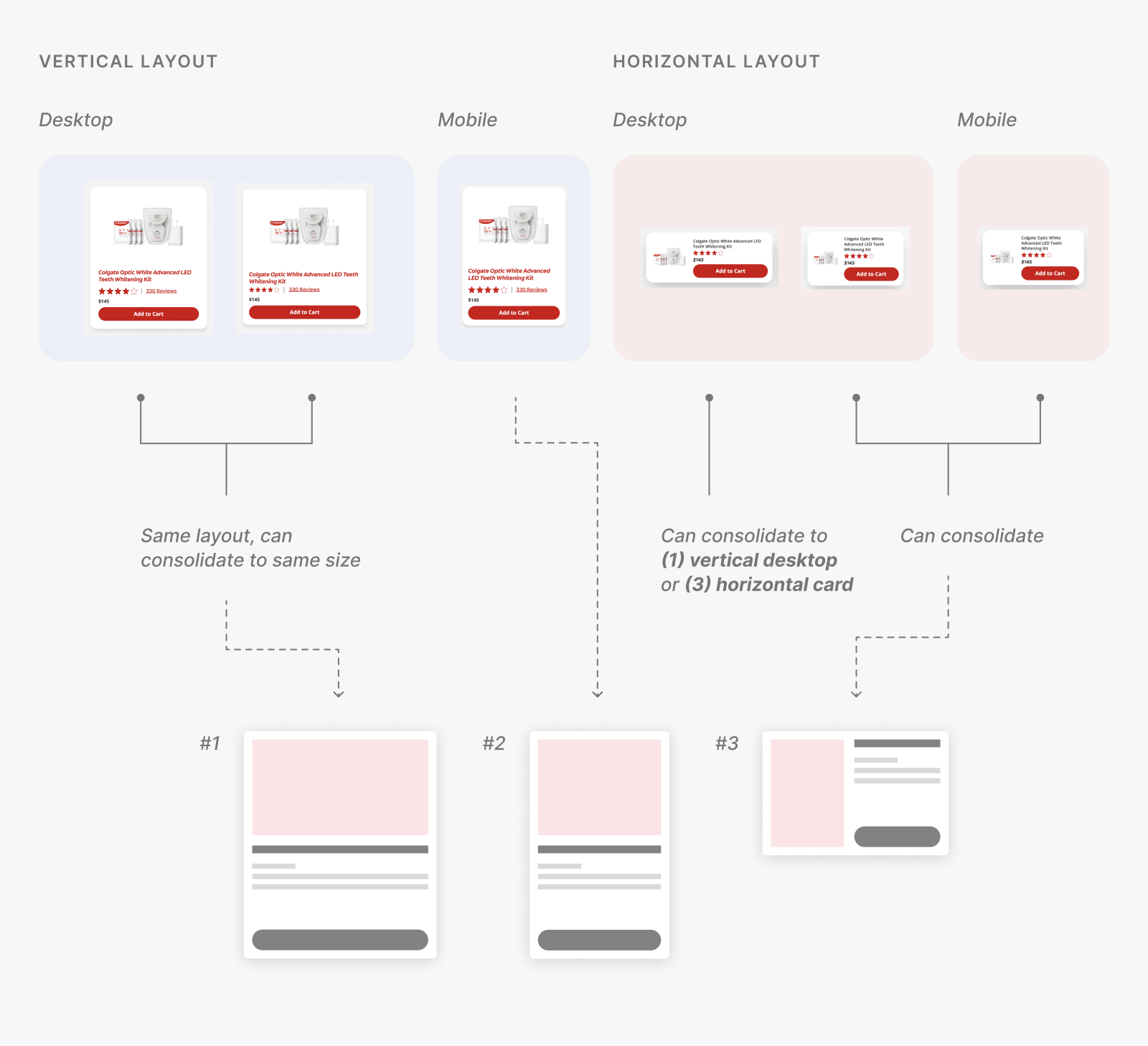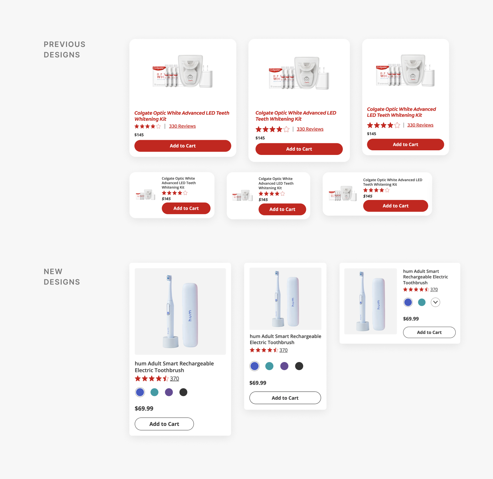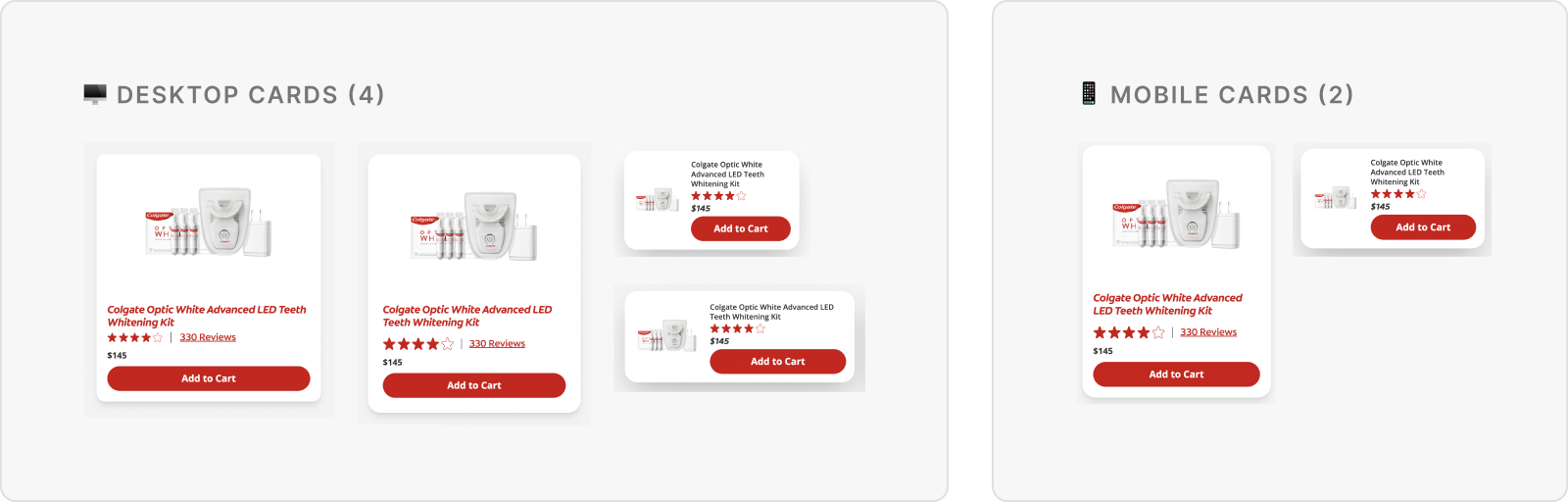 While 6 variations of the product card lived in the ShopSmiles design system, many were redundant due to similar layouts with minor dimensional differences. These cards were then immediately consolidated.