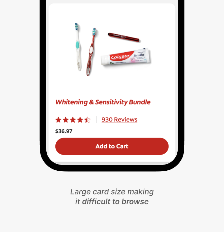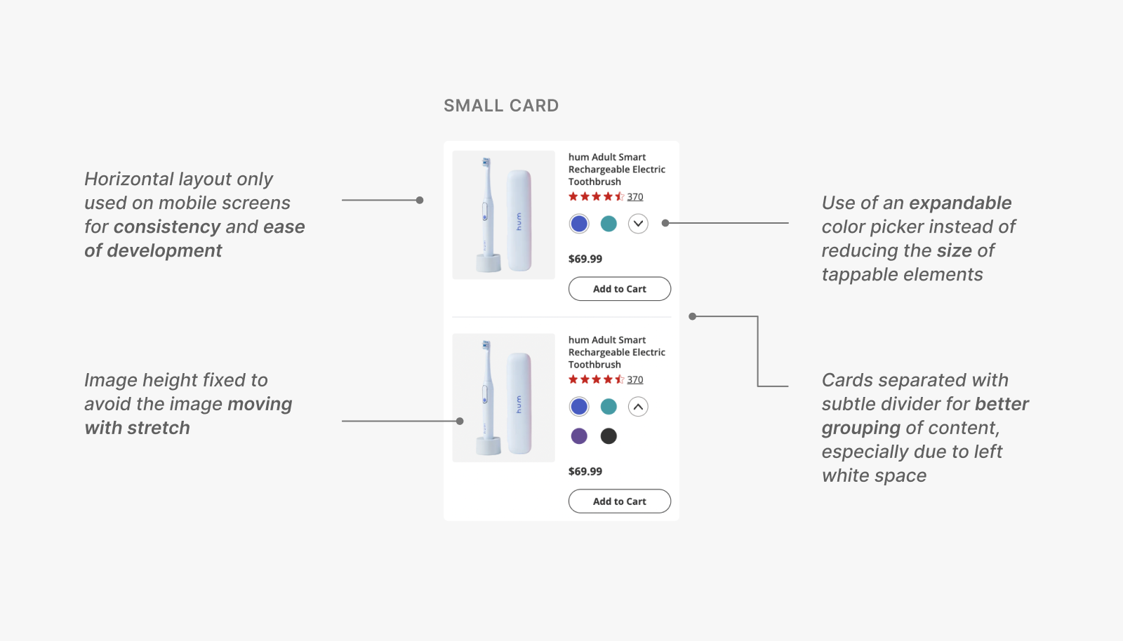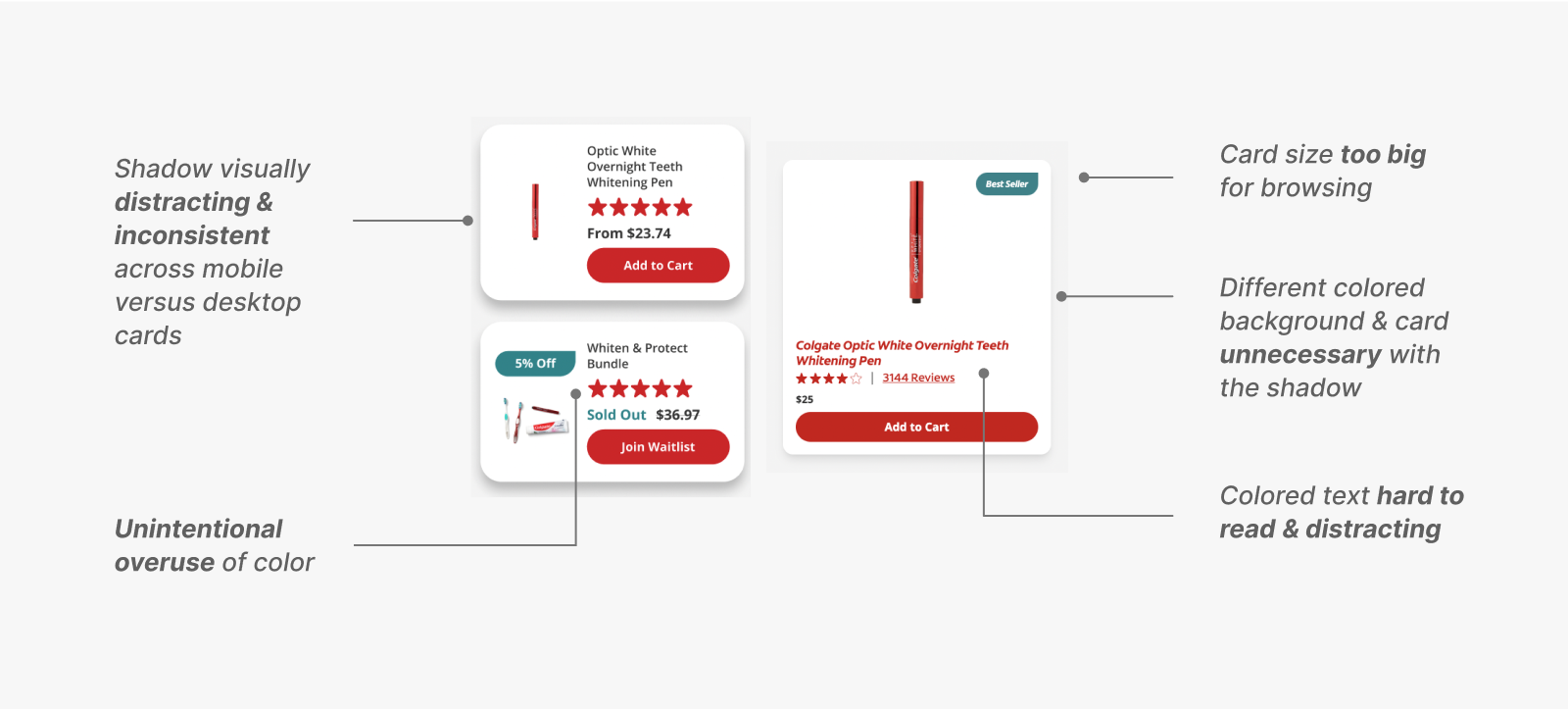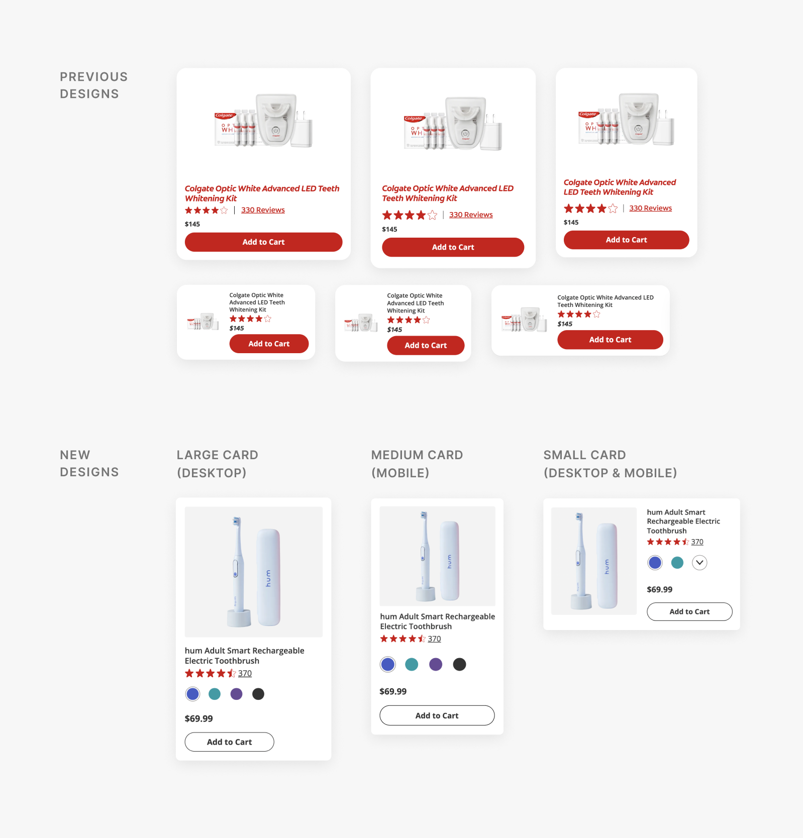 While 6 variations of the product card lived in the ShopSmiles design system, many were redundant due to similar layouts with minor dimensional differences. These cards were then immediately consolidated.
