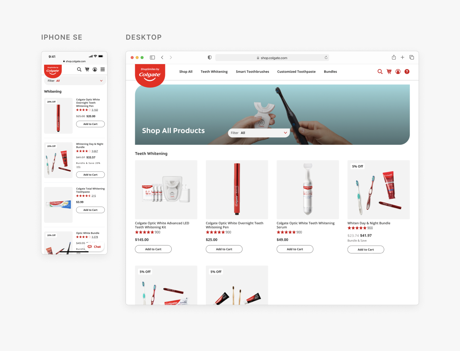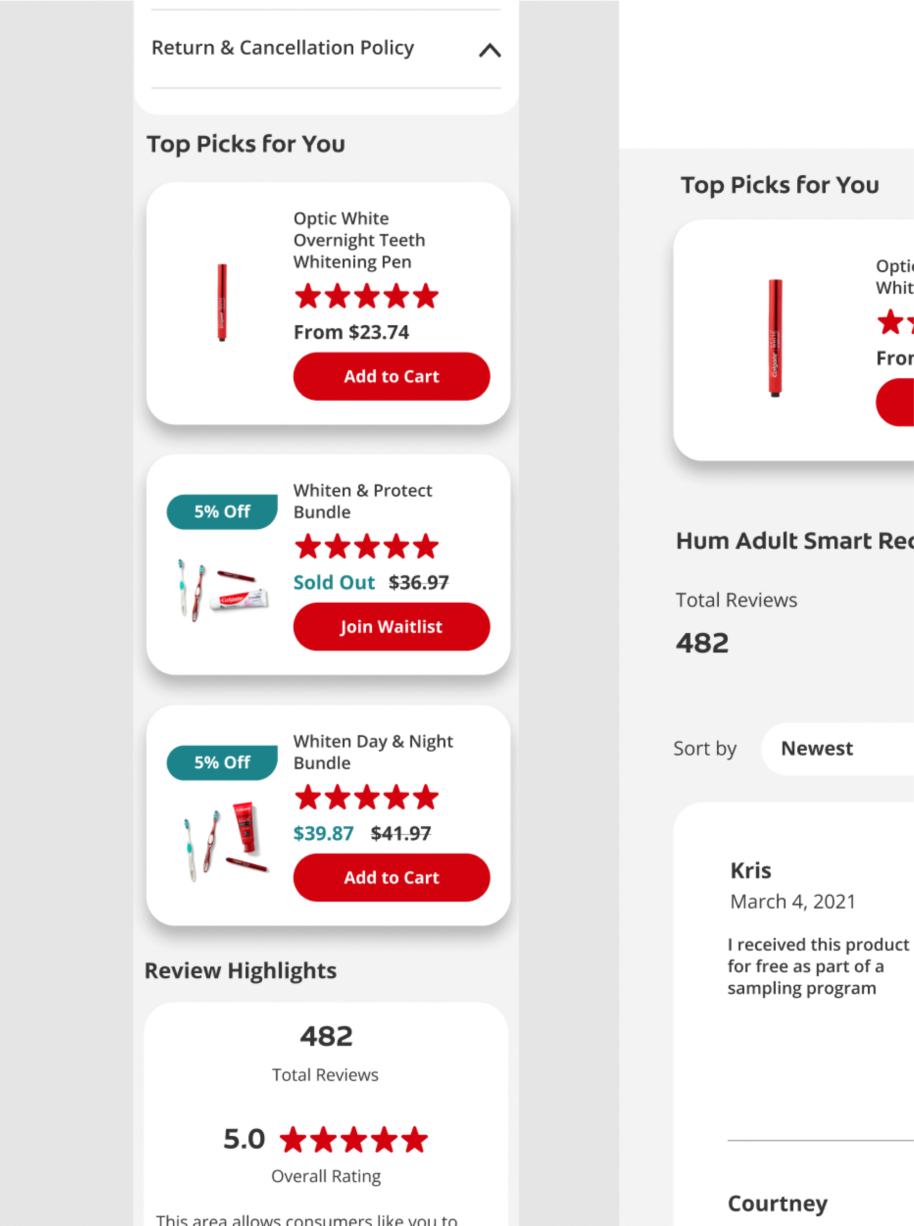 As a UX Intern, I redesigned the product cards within ShopSmiles’ design system to streamline the product browsing experience, decreasing bounce rates by 20% and increasing pages per visit by 0.5*.