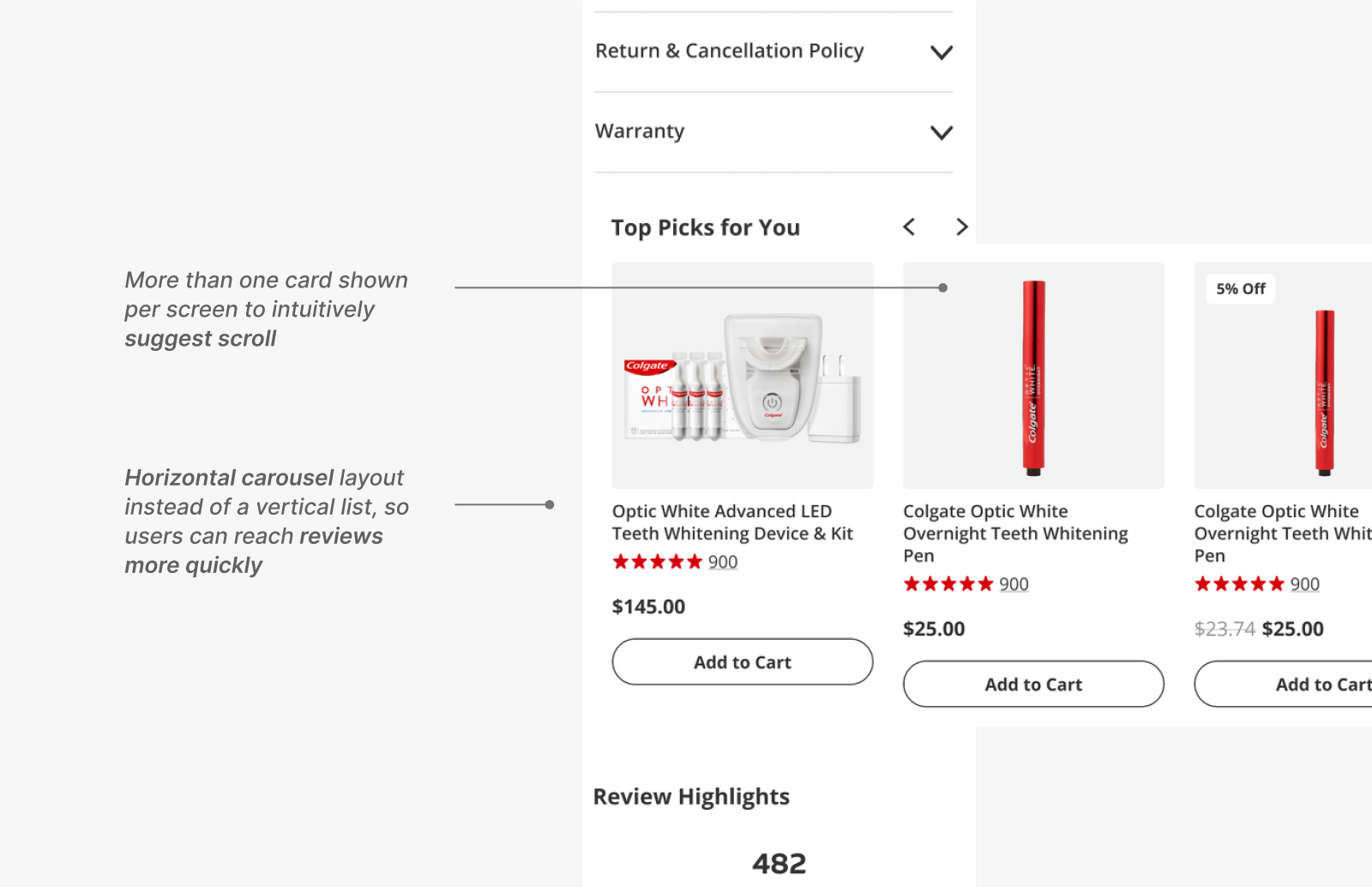 However, I also had areas of the site where a different card would be used. For instance, to reduce the time it takes for users to scroll and reach the reviews, a big user want, I decided to place them in a carousel using the medium cards instead of a horizontal small card.