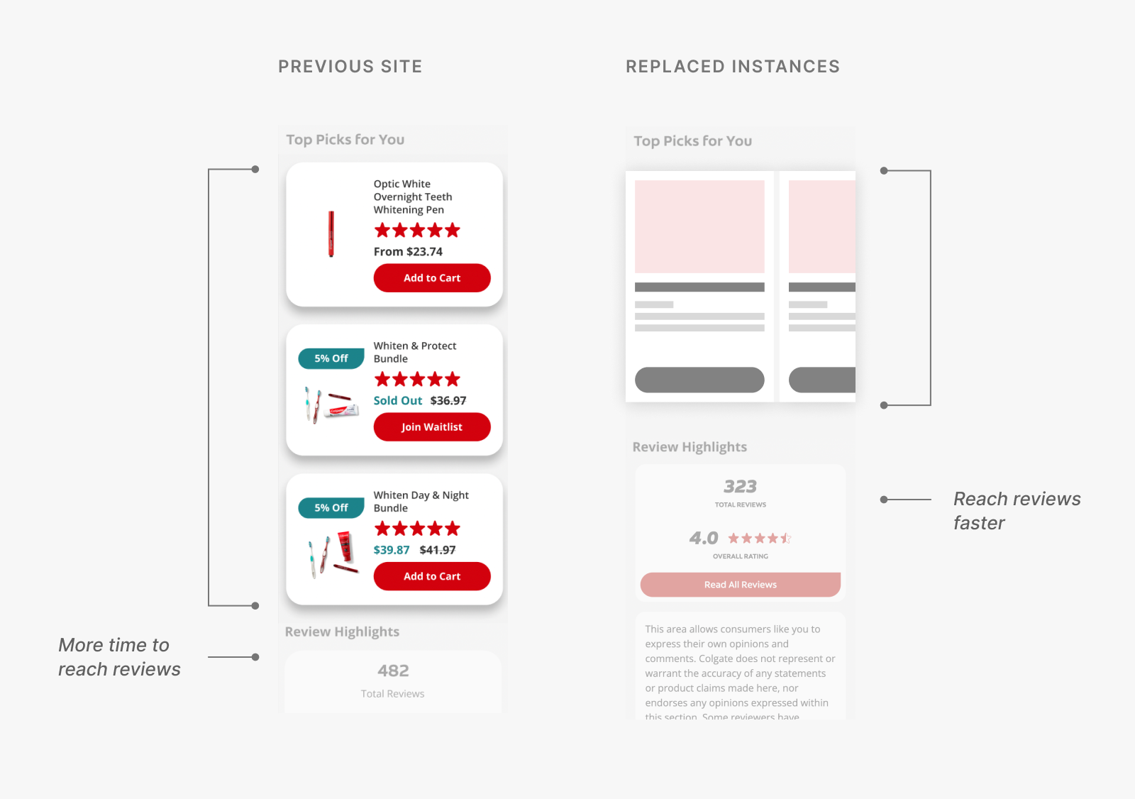 These numbers are anticipated to further improve as the remaining redesigns for ShopSmiles are rolled out. I also participated in reimagining the information architecture of ShopSmiles' product description page (PDP) through user research. Contact me for details if you want to learn more.